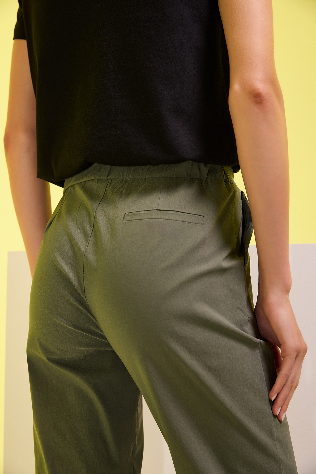 Fashion trousers with solid color viscose. Lateral front pockets. False back pocket. Without zipper. Elastic waistband, soft and comfortable. Lateral slits on the bottom of the leg.
