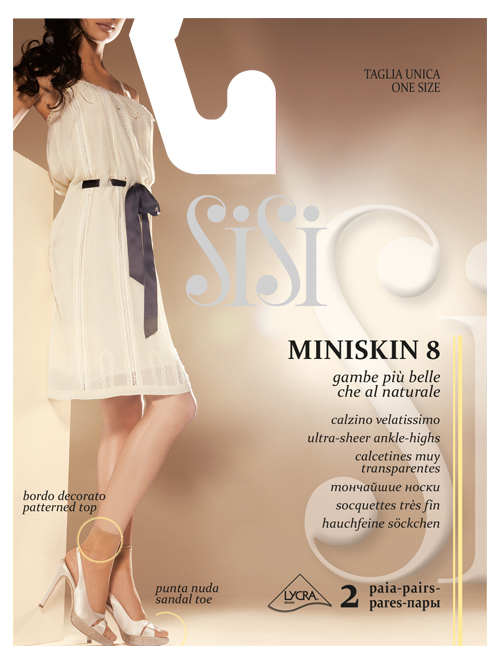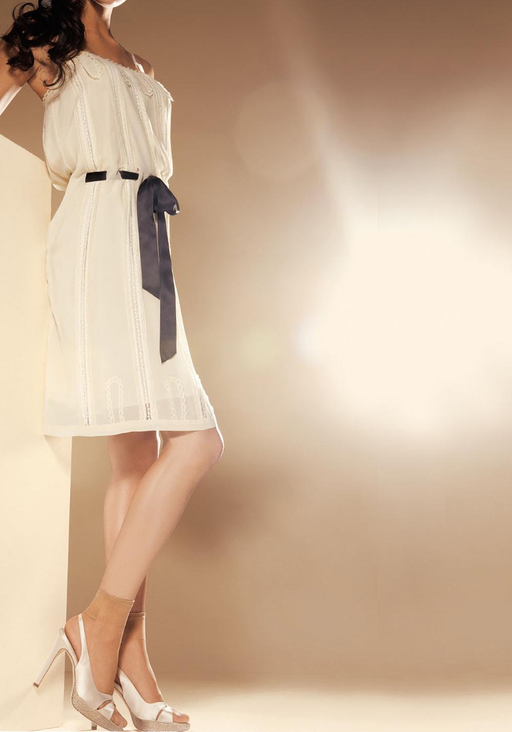 Calzino velatissimo con bordo decorato e punta invisibile. Da indossare anche con i sandali. 8 den.