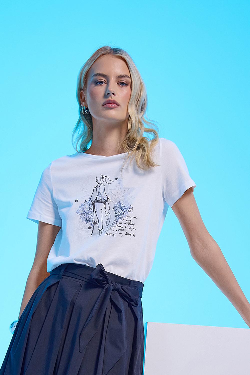 T-shirt moda con cotone. Scollo tondo e manica corta. Stampa di donna stilizzata sul fronte