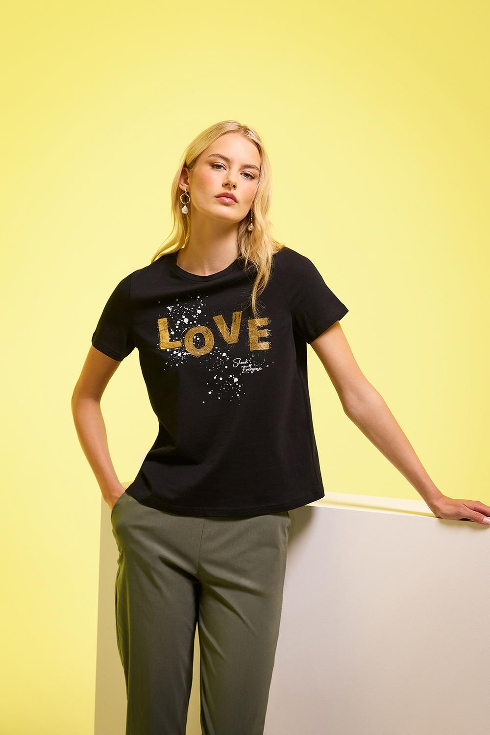 T-shirt moda con cotone. Scollo tondo e manica corta. Scritta "love" laminata oro sul fronte.